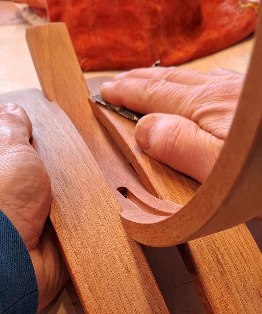 Die Maserung des Holzes läuft mit der Biegung mit und betont dadurch die Eleganz der Form.